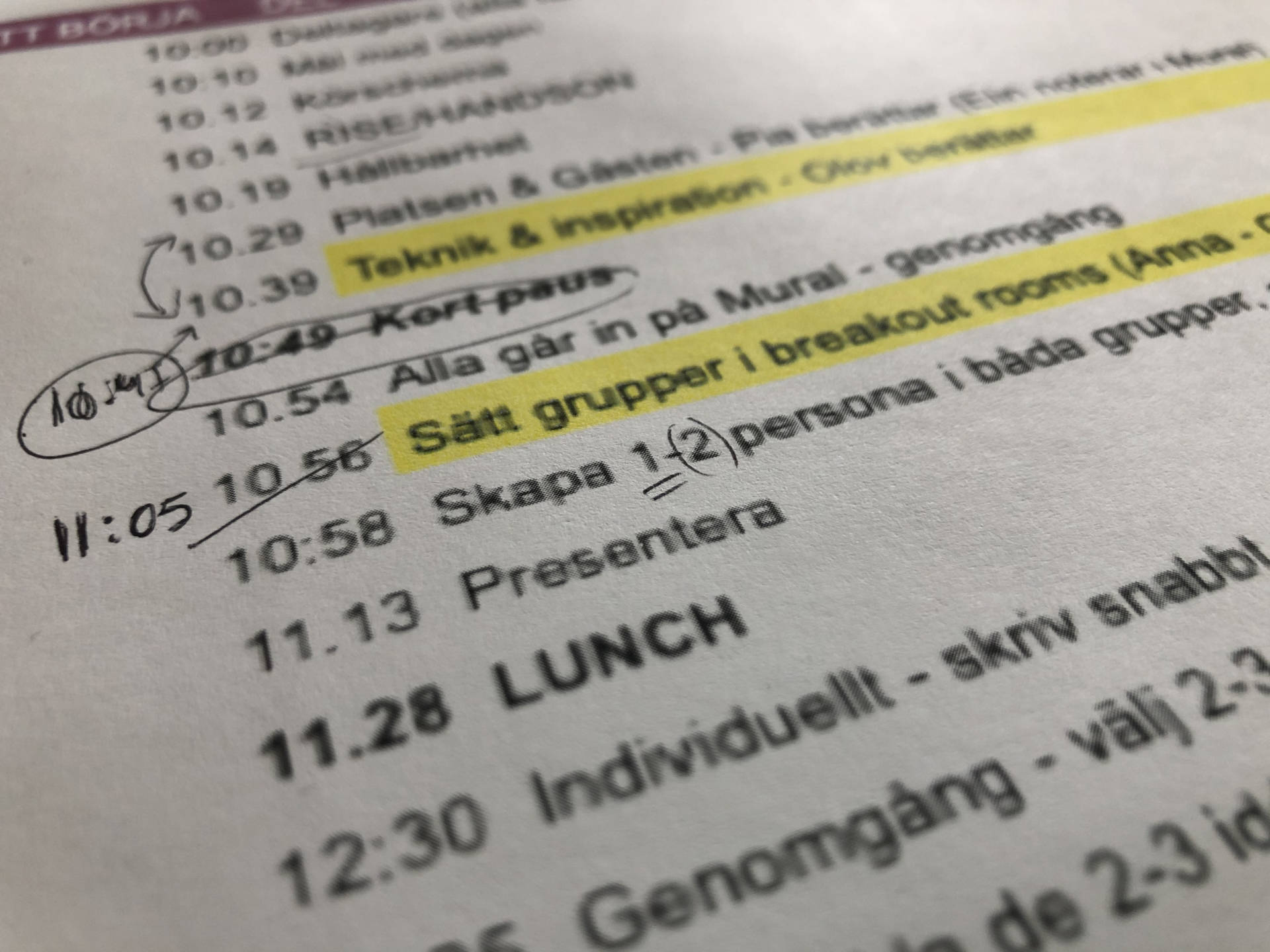 Ett tips till er som vill hålla en workshop på distans är att planera tiden i detalj (även pauser). Det behöver samtidigt finnas ett visst utrymme för att vara spontan så bestäm innan workshopen vilka aktiviteter som är viktigast och vilka som går att ta bort eller minska ner vid behov.